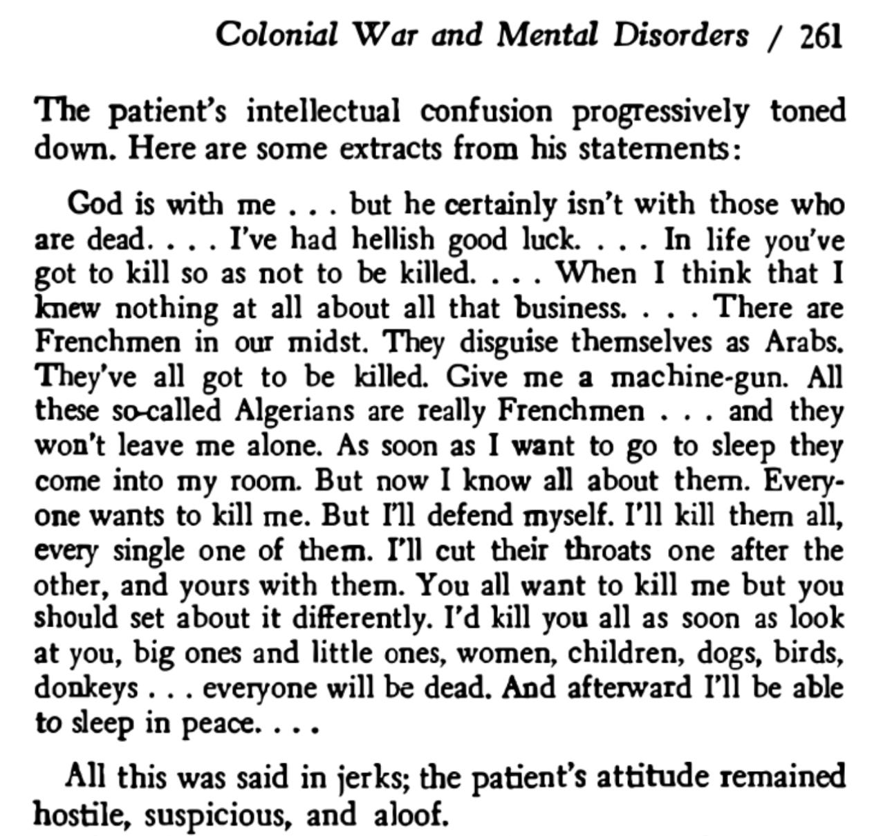 Fanon also documented cases of acute psychosis; hallucinations, paranoid delusions, dissociation, even emerging in civilians with no prior psychiatric history. These breakdowns often followed episodes of extreme violence or prolonged exposure to terror without relief. In another heart-wrenchingly memorable case, Fanon treated a young man who was seized by recurrent, obsessive fantasies of homicide after surviving a brutal mass execution of his village. Twenty-nine Algerian men were shot in the head and chest at point-blank range by French colonial forces in front of him, and then he was shot twice in the arm and leg. He laid for hours among the dead bodies of his neighbours. Brutal complex, compound trauma. Below are Fanon’s chosen extracts from his statement that highlight the patient’s acute paranoid psychosis.