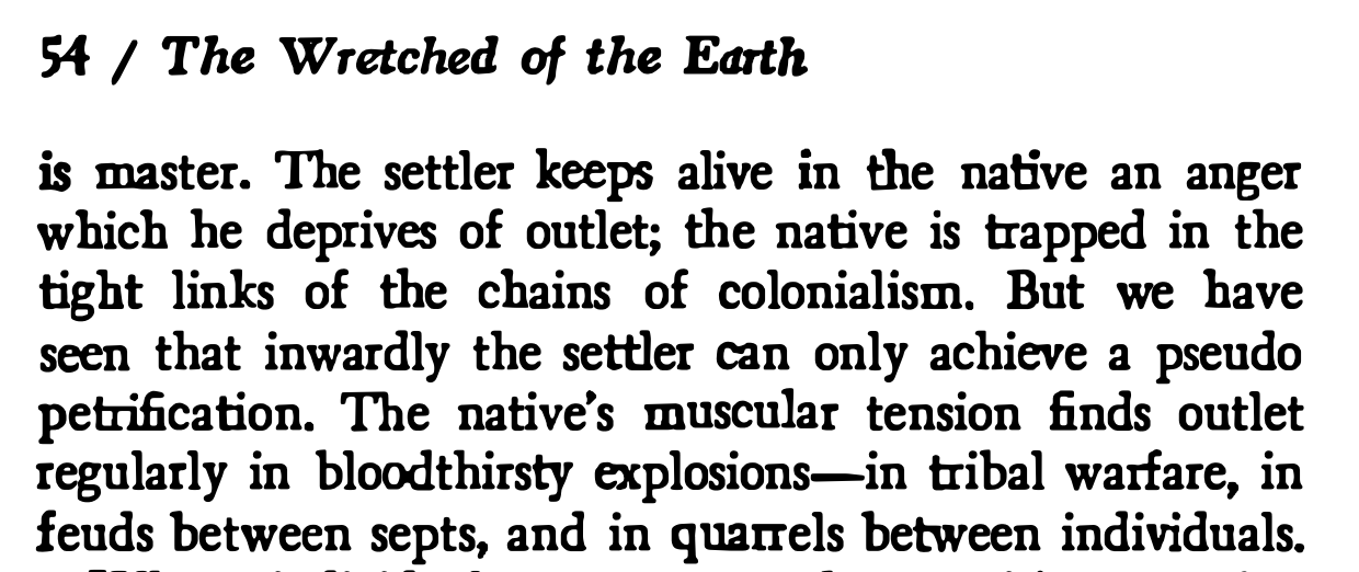 What is remarkable to me is Fanon’s refusal to see these cases as individual abnormalities or pathologies. He situates each and every one within the colonial structure itself. He insisted that they were rational responses to an irrational environment. When reality itself became unpredictable, lawless, and lethal, the mind fractured not because it is weak, but because coherence had been made impossible. Insanity in an insane environment is the only sane response.